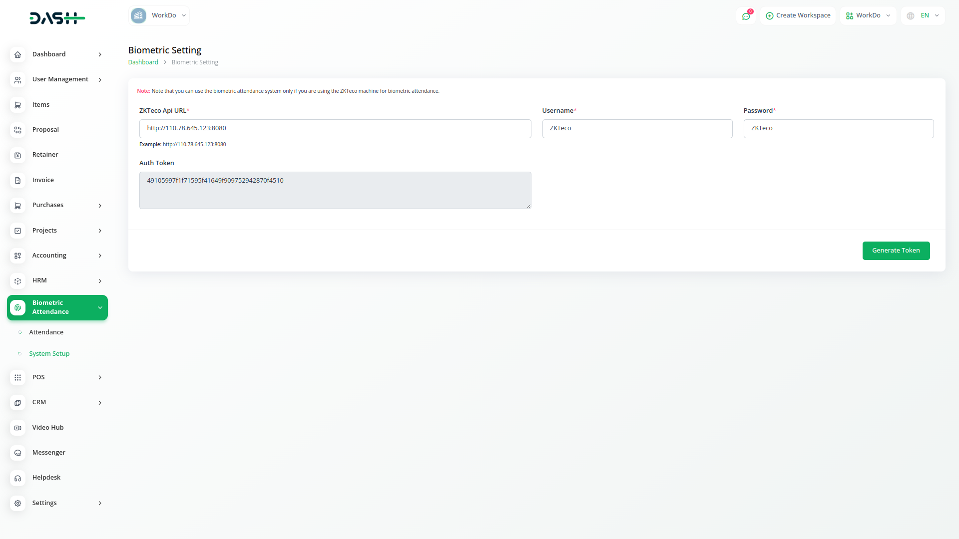 Customize your attendance management system with Dash SaaS by configuring working hours, overtime rules, and holiday calendars, but exclusively available with ZKTeco software integration. By entering ZKTeco API credentials, an auth token is generated, enabling seamless integration with the Dash SaaS biometric attendance module. Once integrated, you gain full control over system settings, and attendance history is conveniently presented within Dash SaaS, providing comprehensive insights into your organization's attendance tracking.