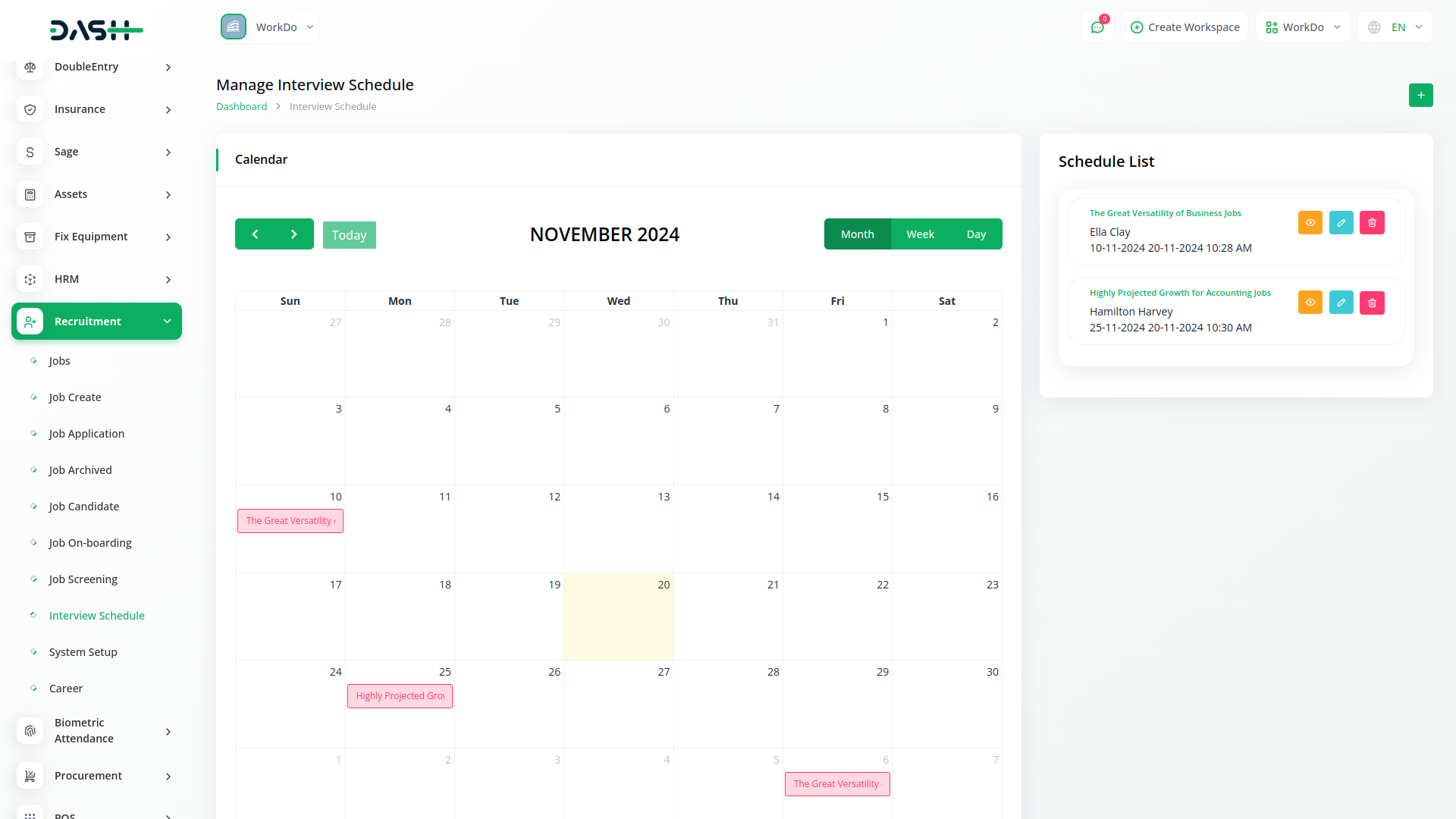 The Dashboard of Recruitment module provides users with an immediate overview of their recruitment activities. It presents key metrics such as the total number of jobs published, expired listings, and the current count of job candidates. Additionally, users can easily view their interview schedule through an interactive calendar and stay updated on recently created job listings and job applications by date. This real-time monitoring tool empowers users to make informed decisions and effortlessly stay on top of their hiring processes.